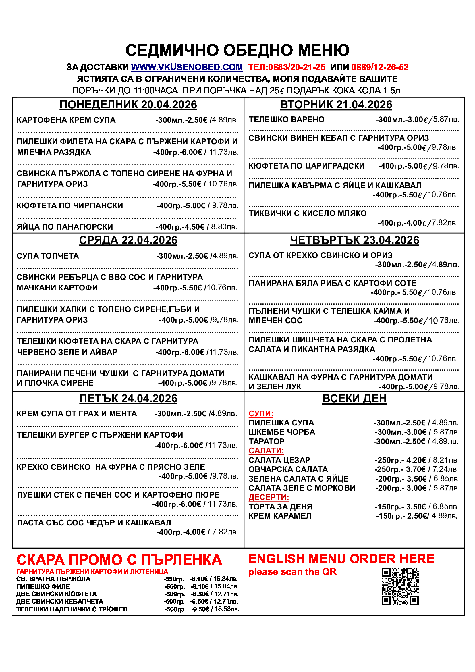 The tavern offers live music every day from Tuesday to Saturday! For more than twenty years we have been offering delicious Bulgarian dishes and drinks and we can organize your birthday, wedding, baptism or just a gathering with friends! For reservations 0889 122-652